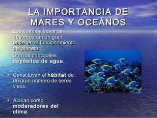 El documento resume los principales puntos sobre el agua en la Tierra. Explica que la Tierra es el único planeta que contiene agua en estado líquido, mientras que Venus tiene agua en estado gaseoso y Marte tiene agua en estado sólido. Además, describe los tres estados del agua, su distribución en la superficie terrestre, el ciclo del agua y algunas propiedades especiales del agua.