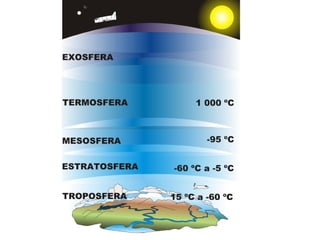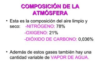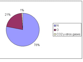 La composición de la atmósfera terrestre consiste principalmente en nitrógeno (78%), oxígeno (21%) y dióxido de carbono (0.036%). La atmósfera no es uniforme y se hace más delgada a mayor altura, haciendo la respiración más difícil en las montañas. Los gases esenciales para los seres vivos son el oxígeno, dióxido de carbono y nitrógeno. La fotosíntesis y la respiración mantienen el equilibrio de la composición atmosférica a