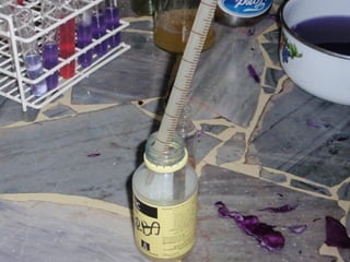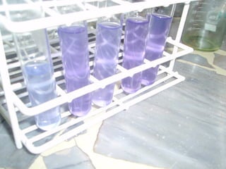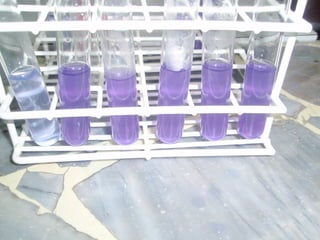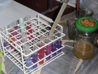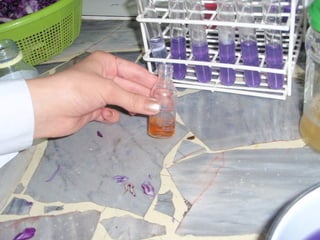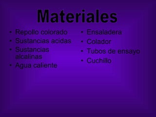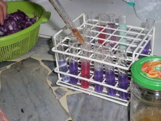 Este documento describe un procedimiento para realizar un trabajo práctico de química utilizando hojas de repollo colorado. Se cortan finamente las hojas y se dejan reposar en agua caliente. Luego se filtra la mezcla y se distribuye en tubos de ensayo junto con sustancias ácidas y alcalinas para observar los cambios y registrarlos.