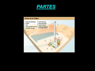 Las centrales termosolares generan electricidad calentando un fluido con radiación solar concentrada para producir vapor e impulsar un generador. Existen centrales de torre central con grandes espejos que concentran la luz en un punto calentando un fluido, y centrales de colectores distribuidos que usan colectores para concentrar la luz y calentar el fluido hasta 300°C para generar vapor e impulsar un generador eléctrico.