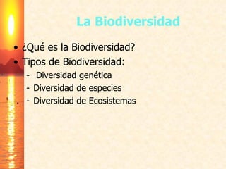 Este documento trata sobre la biodiversidad y la vida silvestre, incluyendo las diferentes formas de biodiversidad, técnicas para conservar la vida silvestre, la extinción de especies y sus causas. Explica los tipos de biodiversidad, la conservación de la vida silvestre a través de leyes y santuarios, las categorías de especies en peligro de extinción, y las causas directas e indirectas de la extinción como la cacería, la pérdida de hábitat y la contaminación.