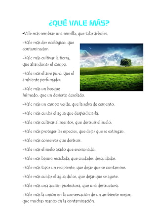 El documento presenta varios principios para proteger el medio ambiente, como reducir lo innecesario, reutilizar lo que se tiene, y reciclar todo lo posible. También destaca que vale más proteger la naturaleza que destruirla, ya que es más importante conservar los recursos naturales como el agua, el suelo y los bosques que contaminarlos o abandonarlos. Finalmente, hace un llamado a cuidar el medio ambiente para garantizar la supervivencia de las especies y la calidad de vida futura.