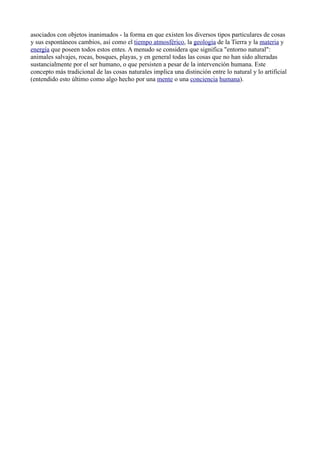 Este documento define la naturaleza como el mundo natural o físico que incluye fenómenos como la vida, los objetos no artificiales y los procesos asociados con objetos inanimados. La naturaleza se extiende desde el mundo subatómico hasta el galáctico. También se refiere a la naturaleza como el dominio de seres vivos como plantas y animales, así como procesos naturales como el clima, la geología y los cambios espontáneos de las cosas. A menudo se considera que significa el entorno
