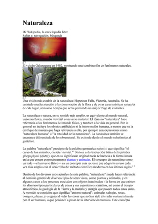 Este documento define la naturaleza como el mundo natural o físico, que incluye todos los fenómenos del universo desde lo subatómico hasta lo galáctico. La naturaleza generalmente no incluye objetos artificiales ni intervención humana, a menos que se especifique lo contrario. La palabra naturaleza proviene del latín "natura" y del griego "physis" y originalmente se refería a la forma en que crecen espontáneamente las plantas y animales. Actualmente, la naturaleza puede referirse al reino