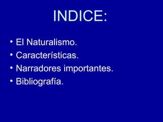 El documento resume las características del naturalismo como corriente literaria que evolucionó del realismo gracias a Émile Zola a finales del siglo XIX. Siguiendo los principios científicos de la época, el naturalismo ve al hombre como producto de su herencia y ambiente. Presenta de forma cruda y objetiva la realidad mediante descripciones detalladas y personajes dominados por fuerzas primitivas. Entre los principales narradores naturalistas se encuentran Emilia Pardo Bazán y Vicente Blasco Ibáñez.