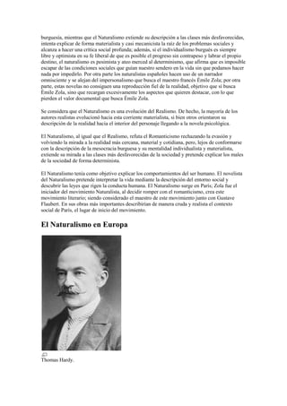 El naturalismo fue un estilo literario basado en reproducir la realidad de forma objetiva y documental. Su máximo representante fue Émile Zola. Se extendió por Europa a finales del siglo XIX, influenciado por el positivismo, utilitarismo, evolucionismo y materialismo histórico. Los naturalistas reflejaban cómo la herencia, las taras sociales y el entorno determinaban la conducta humana de forma pesimista. Aunque similar al realismo, el naturalismo se centraba más en las clases desfavorecidas y pretendía explicar los problemas sociales de forma material