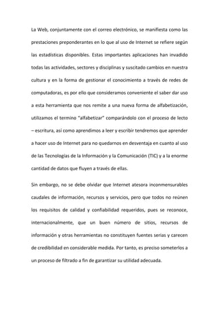 Este documento introduce el tema de la convergencia entre la información y la tecnología, especialmente a través de Internet. Explica que la información se ha convertido en un recurso estratégico clave, mientras que las tecnologías han evolucionado rápidamente. Actualmente, la información y la tecnología convergen principalmente a través de Internet y la Web, lo que ha causado cambios significativos en la cultura y la forma en que manejamos el conocimiento. Por lo tanto, es importante aprender a usar estas herramientas de manera efectiva para no qued