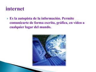 Este documento describe los navegadores, páginas web, direcciones web, dominios y buscadores. Explica que los navegadores permiten acceder a información en línea de forma escrita, gráfica o en video desde cualquier lugar del mundo y que las páginas web almacenan esta información. También define las tres partes básicas de una dirección web, los cuatro tipos principales de buscadores y algunos consejos para optimizar las búsquedas.