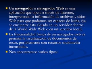 Un navegador web es una aplicación que permite visualizar sitios y páginas de internet interpretando archivos y códigos. Los navegadores más populares son Mozilla Firefox, Windows Internet Explorer, Safari, Opera, Google Chrome, Netscape y Epiphany, cada uno con características y orígenes diferentes.