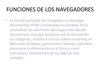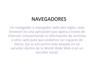 Un navegador web es una aplicación que permite navegar por Internet interpretando archivos y sitios web. Los principales navegadores son Google Chrome, Mozilla Firefox, Internet Explorer. Cada uno tiene funciones como cargar páginas rápido, organizar pestañas, agregar extensiones y crear marcadores.