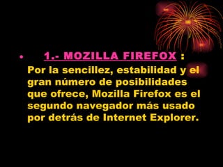 Este documento describe 15 navegadores web populares, incluyendo Firefox, Chrome, Opera, Internet Explorer y Safari. Cada navegador se destaca por características únicas como simplicidad, estabilidad, personalización, seguridad y rendimiento.