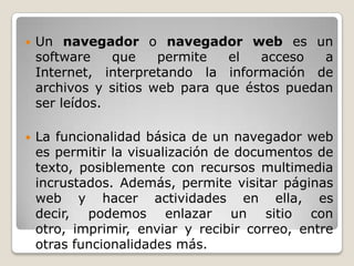 El documento describe los navegadores web, sus funciones básicas como permitir la visualización de páginas web e interactuar con ellas, y algunos de los navegadores más conocidos como Mozilla Firefox, Google Chrome, Internet Explorer y Opera. Explica brevemente las características de Firefox, Chrome e Internet Explorer, y enfatiza la importancia de conocer el funcionamiento de cada navegador para usarlos adecuadamente y evitar problemas de seguridad u otros.