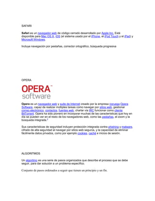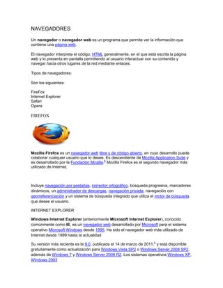 Un navegador web permite ver páginas web e interactuar con su contenido. Los principales navegadores son Firefox, Internet Explorer, Safari y Opera. Firefox es un navegador de código abierto mientras que Internet Explorer se desarrolló para Windows. Safari está disponible para macOS e iOS y Opera incluye características como pestañas y seguridad.