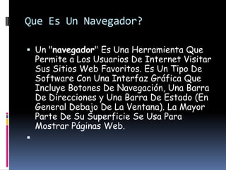Este documento define qué es un navegador web y describe los principales tipos de navegadores, incluyendo Internet Explorer, Firefox, Opera, Google Chrome, Safari y Netscape. Explica brevemente las características y cuotas de mercado de cada uno. Internet Explorer y Firefox son los navegadores más populares actualmente, con cuotas de mercado del 28% y 32% respectivamente, mientras que Google Chrome está ganando terreno con un 37%.