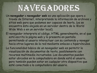 Un navegador web permite a los usuarios ver y navegar por páginas web al interpretar archivos como HTML y mostrar su contenido e hipervínculos en la pantalla. Los navegadores más populares incluyen Chrome de Google, Firefox de Mozilla, Opera, Internet Explorer y Safari.
