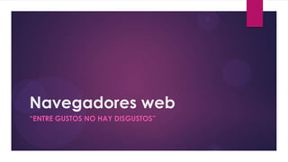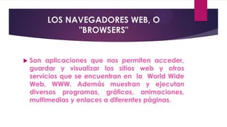 Los navegadores web son aplicaciones que permiten acceder y visualizar sitios web. Los principales navegadores son Internet Explorer, Firefox, Chrome, Safari y Opera. Cada uno tiene características particulares como seguridad, personalización, velocidad y compatibilidad con sistemas operativos. Los navegadores continúan evolucionando para mejorar la experiencia del usuario al navegar en Internet.