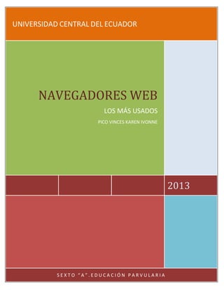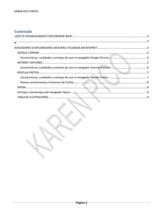 Este documento describe y compara los navegadores web más populares, incluyendo sus características y ventajas. Explica que un navegador es el software que permite ver páginas web y navegar entre ellas. Luego discute los navegadores más utilizados actualmente como Google Chrome, Internet Explorer, Mozilla Firefox y Opera, resaltando algunas de sus funciones clave.