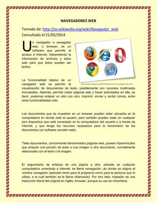 Un navegador web permite a los usuarios acceder a Internet e interpretar la información de sitios web y archivos para visualizarlos. Los navegadores permiten ver documentos de texto y multimedia, visitar páginas web, y enlazar entre sitios a través de hipervínculos. Los documentos pueden estar almacenados localmente o en servidores remotos conectados a Internet.