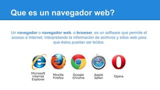 Un navegador web es un software que permite acceder a Internet interpretando archivos y sitios para que sean legibles. Las URL sirven para nombrar recursos en línea como sitios web. Algunos navegadores populares son Google Chrome y Mozilla Firefox, los cuales comparten características como barras de direcciones y la habilidad de actualizar páginas.