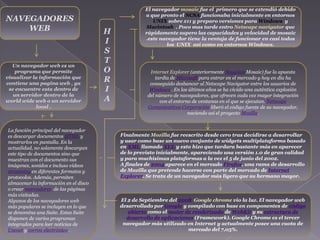 El primer navegador web popular fue Mosaic, pero fue superado rápidamente por Netscape Navigator. Más tarde, Microsoft lanzó Internet Explorer que desplazó a Navigator como el navegador dominante en Windows. Otros navegadores como Firefox y Google Chrome también ganaron popularidad, ofreciendo opciones alternativas a Internet Explorer.