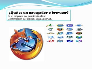 Un navegador web es un programa que permite visualizar la información de una página web. Los navegadores más utilizados son Google Chrome, debido a su velocidad y optimización de pestañas, Internet Explorer 8 que permite añadir "trozos" de páginas a favoritos, y Mozilla Firefox, un navegador gratuito conocido por su velocidad, soporte y seguridad.