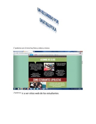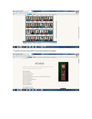 El documento habla sobre una página web que contiene fotos, videos y música al inicio, así como enlaces a sitios web de estudiantes y recursos útiles agregados por la profesora.