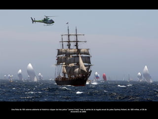 Este documento presenta una serie de imágenes que muestran diferentes aspectos de la navegación a vela, incluyendo regatas oceánicas, veleros históricos, yates clásicos y modernos, buques escuela, réplicas de navíos antiguos y combates simulados. Las fotos capturan momentos como salidas y llegadas a puerto, navegación en mares abiertos, concentraciones de veleros y detalles de las tripulaciones a bordo. En conjunto, el documento ofrece una visión general de la diversidad y tradic