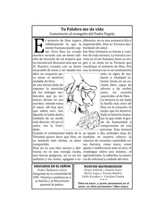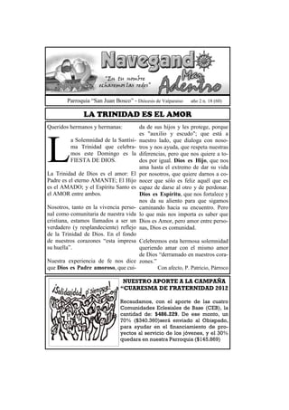 El documento resume la solemnidad de la Santísima Trinidad, explicando que Dios es amor entre el Padre, el Hijo y el Espíritu Santo. También incluye información sobre las actividades y eventos de una parroquia, incluyendo recaudaciones de fondos, servicios comunitarios y reuniones programadas.