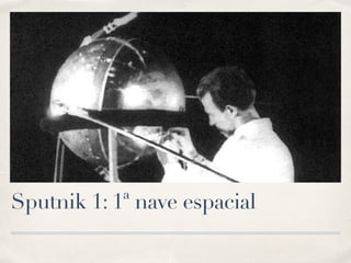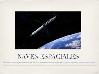 Este documento resume la historia temprana de las naves espaciales, comenzando con Sputnik 1 como la primera nave espacial en 1957, seguida por el primer ser vivo en el espacio (Laika) y los primeros humanos en el espacio Yuri Gagarin y Valentina Tereshkova. También describe el alunizaje del Apolo 11 en 1969 y la primera caminata lunar, así como las misiones de las naves espaciales Pioneer, Voyager y Rosetta para explorar el sistema solar. Finalmente, menciona la estación espacial MIR y