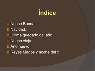 Este documento resume las celebraciones navideñas de 2009-2010, incluyendo Nochebuena con la familia, Navidad con la llegada de Papá Noel y una comida familiar, una lesión en el tobillo durante un partido de fútbol que arruinó las vacaciones, Año Nuevo con comidas familiares, y la llegada de los Reyes Magos el 5 de enero con regalos para los niños.