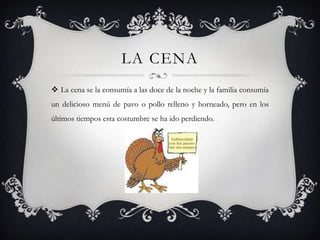 Las principales costumbres navideñas en Ecuador incluyen la cena de Nochebuena con pavo o pollo relleno, el árbol de Navidad adornado, las misas del Gallo y del Niño el 24 y 25 de diciembre, el pesebre o nacimiento con figuras de porcelana o madera, el intercambio de tarjetas navideñas con imágenes de Santa Claus, la tradición de villancicos y canciones religiosas, y el intercambio de regalos después de la cena que a menudo son traídos por el