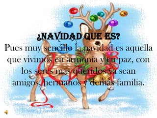 La Navidad es un tiempo para estar en armonía y paz con los seres queridos como la familia y amigos. Deberíamos vivir la Navidad juntos como una familia sin miedo a expresar nuestra inocencia. La Navidad es un tiempo de amor y paz donde todos somos iguales sin rencores.