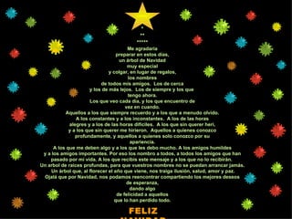 Este documento describe el deseo de preparar un árbol de Navidad especial en el que en lugar de colgar regalos, se colgarán los nombres de todos los amigos de la persona, tanto cercanos como lejanos, pasados y presentes, para recordarlos a todos y desearles lo mejor en las fiestas.