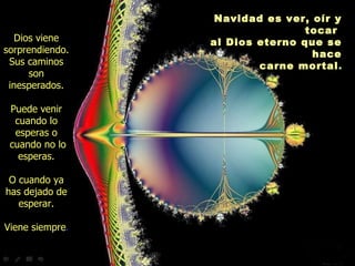 Este documento habla sobre el significado de la Navidad. Explica que Navidad es cuando Dios se hace mortal en la persona de Jesucristo para redimir a la humanidad. También dice que Navidad es acoger a Dios que nace en los más pobres y celebrarla con paz, amor y alegría. Finalmente desea a todos una feliz Navidad y un próspero año nuevo.