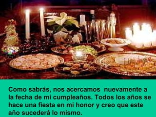 El documento es una carta de Jesucristo reflexionando sobre cómo la gente celebra su cumpleaños (Navidad) cada año sin recordar el verdadero significado. Jesús expresa que aunque la gente hace fiestas en su honor, no lo invitan ni lo reconocen. En cambio, la atención se centra en figuras como Santa Claus y los regalos materiales. Jesús espera que esta Navidad la gente lo deje entrar en sus vidas y recuerde que vino al mundo para enseñar.