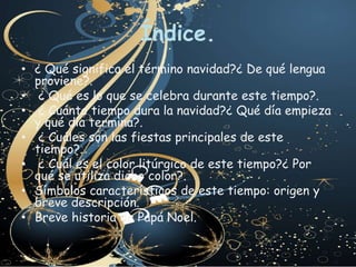 El documento describe la Navidad, incluyendo su significado, duración, principales festividades, color litúrgico y símbolos como el Belén, los Reyes Magos y el árbol de Navidad. También resume brevemente la historia de Papá Noel/Santa Claus, desde sus orígenes como San Nicolás de Bari hasta su transformación en un personaje bonachón vestido de rojo gracias a la publicidad de Coca-Cola.
