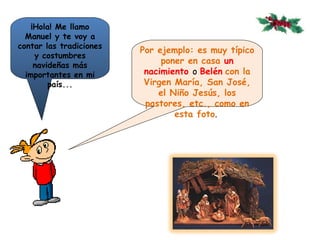 Las principales tradiciones navideñas en España incluyen poner un Belén o nacimiento en casa, celebrar el sorteo de la Lotería de Navidad el 22 de diciembre, reunirse en familia para cenar la noche del 24 de diciembre llamada Nochebuena, y reunirse de nuevo el 25 de diciembre para comer en el Día de Navidad.