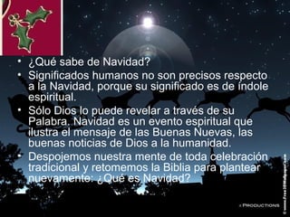 El documento presenta el significado espiritual y bíblico de la Navidad. Explica que la Navidad conmemora el nacimiento de Jesucristo como un evento histórico real, no solo como una fecha. Celebra tres aspectos: 1) la encarnación de Dios en la historia humana, 2) el nacimiento de un Salvador y no de una fecha, y 3) la revelación del amor eterno de Dios para la humanidad. Concluye que la verdadera Navidad es conocer y amar a Cristo, no las tradiciones comerciales que lo han