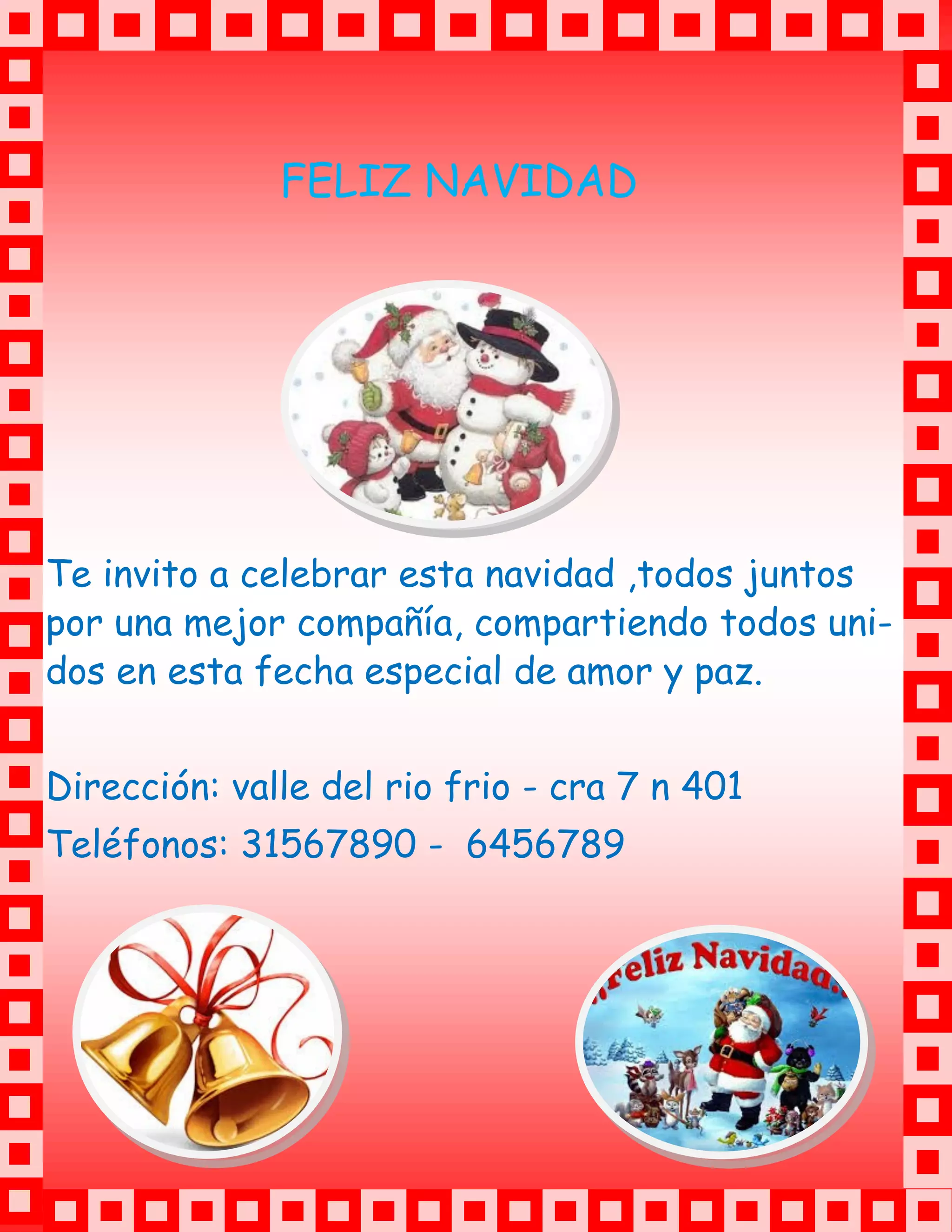 Teinvito a celebrar esta navidad ,todos juntos por una mejor compañía, compartiendo todos uni- dos en esta fecha especial de amor y paz.