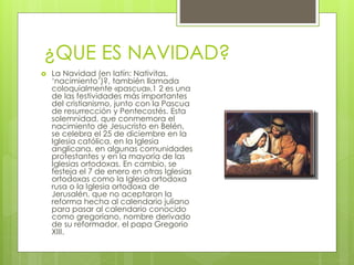 Este documento define varios términos relacionados con la Navidad. Explica que la Navidad conmemora el nacimiento de Jesucristo el 25 de diciembre y que algunas iglesias ortodoxas lo celebran el 7 de enero. Define la Epifanía como la manifestación de Jesús como humano en la tierra. Finalmente, describe brevemente el nacimiento de Jesús según las creencias cristianas y la tradición de los villancicos navideños.
