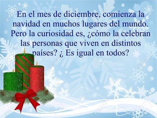Este documento describe cómo se celebra la Navidad en diferentes países del mundo. Se mencionan tradiciones navideñas en países como Australia, Gran Bretaña, Brasil, China, España, Alemania, Estados Unidos, Rusia y Rumanía. Algunas costumbres comunes incluyen la cena familiar, el árbol de Navidad y figuras como Santa Claus o Papá Noel. Sin embargo, cada cultura aporta sus propias particularidades, como el pudín de ciruela con pepita de oro en Australia o los mercados navideños en Alemania.