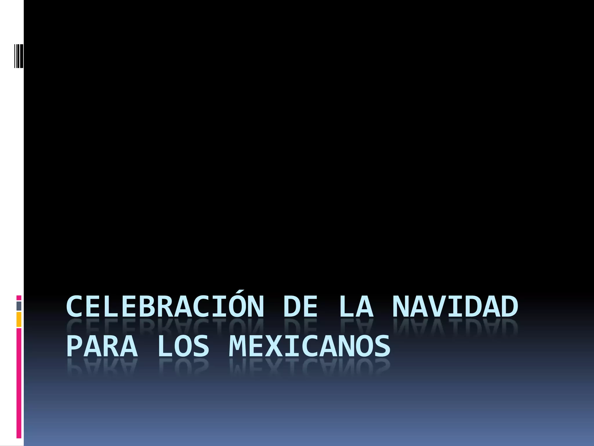 Este documento describe las tradiciones y celebraciones de la Navidad en México. Explica que la Navidad conmemora el nacimiento de Jesucristo y describe las costumbres mexicanas como las posadas, pastorelas, piñatas, cantos navideños, tradiciones indígenas y españolas, la Nochebuena, el Año Nuevo y el Día de Reyes. También explica que las posadas representan los nueve meses de gestación de Jesús en el vientre de María.