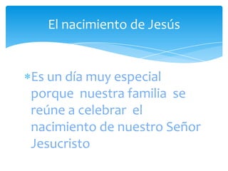 El documento habla sobre el significado de la Navidad. Explica que se conmemora el nacimiento de Jesucristo en Belén el 25 de diciembre, aunque los evangelios no mencionan una fecha exacta. La Iglesia católica estableció esta fecha para absorber las tradiciones paganas del solsticio de invierno, como el Saturnal romano y el Yule del norte de Europa. La Navidad es una fiesta importante donde las familias se reúnen.
