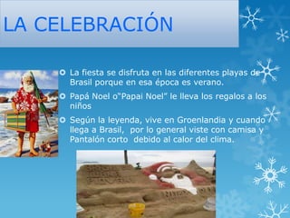 En Brasil, la Navidad se celebra en la playa debido al calor del verano. Papá Noel viste ropa ligera y deja regalos para los niños. Se construye un árbol flotante gigante en Río de Janeiro y las familias decoran pesebres. La cena típica incluye pavo, arroz, frijoles y panetones rellenos de chocolate. Los brasileños también tienen tradiciones como saltar con una copa de champán o lavar umbrales con agua salada para atraer buena suerte.