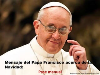 El Papa Francisco describe cómo cada persona puede representar diferentes aspectos de la Navidad a través de sus acciones y virtudes, como ser la luz que ilumina el camino de los demás con bondad y generosidad, los ángeles que cantan un mensaje de paz y amor, o la cena de Navidad al alimentar al pobre. El mensaje insta a las personas a recibir al Salvador en silencio y a establecer la paz interior de una Navidad perenne.