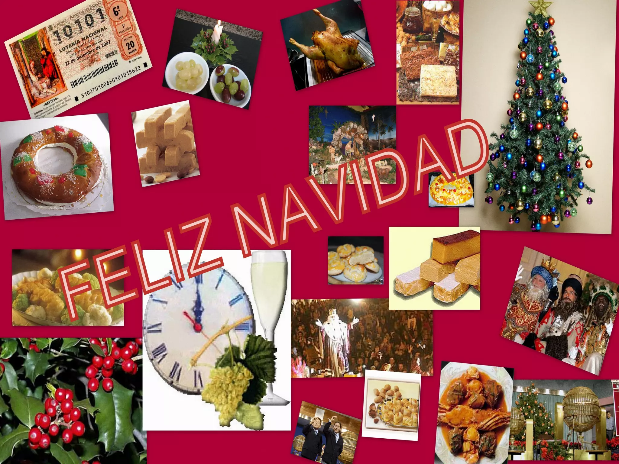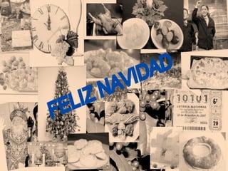 El documento describe varias tradiciones navideñas españolas como la cena de Nochebuena con bacalao y coliflor, el sorteo de la Lotería de Navidad el 22 de diciembre, y comidas que incluyen marisco, capón de Vilalba, turrón, mazapán. También menciona símbolos como el acebo, el árbol y belén de Navidad, la estrella, y villancicos. Otras tradiciones son la nochevieja con doce uvas, la cabalgata de Reyes Magos, y el roscón