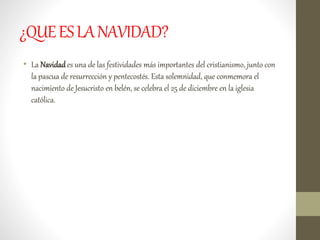 La Navidad conmemora el nacimiento de Jesucristo el 25 de diciembre y es una de las festividades más importantes del cristianismo. Tradicionalmente incluye símbolos como el árbol de Navidad, coronas de adviento, calcetines colgados y belenes, así como villancicos y cuentos sobre figuras navideñas. El verdadero significado de la Navidad es celebrar el amor de Dios al enviar a su Hijo para salvar al mundo.