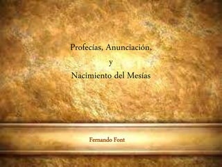 Este documento resume varias profecías y eventos clave relacionados con el nacimiento de Jesús, como las profecías de su reinado justo, la anunciación a María, el nacimiento en Belén, la visita de los pastores y magos, y la huida a Egipto para escapar de Herodes. Finalmente, José, María y el niño Jesús se establecen en Nazaret, cumpliendo otra profecía.
