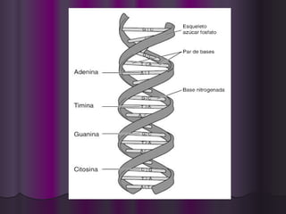 El documento resume la historia y estructura del ADN. Friedrich Miescher aisló por primera vez el ADN en 1869 y lo llamó "nucleína". En 1914, Robert Feulgen descubrió que el ADN se teñía de rojo y estaba presente en todas las células. El ADN está formado por cuatro tipos de nucleótidos con bases nitrogenadas diferentes. Su estructura es una doble hélice formada por dos cadenas entrelazadas.