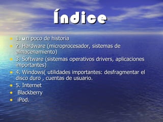 El documento proporciona una introducción a la historia de la informática, el hardware, el software y aplicaciones importantes como Windows, Internet, Blackberry e iPod. Explica las cinco generaciones de ordenadores desde las primeras basadas en válvulas hasta las actuales de microprocesadores. Describe componentes como el microprocesador, dispositivos de almacenamiento y periféricos. También cubre sistemas operativos, drivers, aplicaciones y utilidades de Windows como desfragmentar discos y cuentas de usuario. Finalmente, resume los servicios básicos de Internet y tip